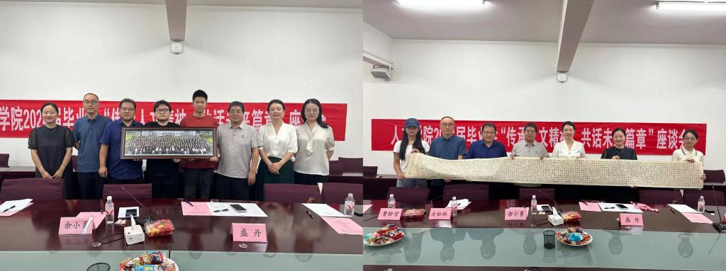 座谈会后,毕业生们向学院赠送2024届全体本科毕业生合影,毕业生夏妍月向学院赠送书法长卷作品《大学》,领导老师向毕业生赠送纪念礼物。