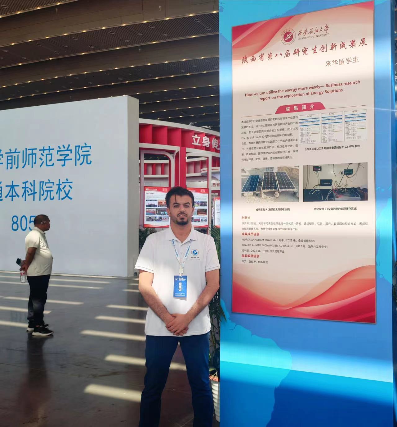 在陕西省第八届研究生创新成果展上,william受邀参展。由william也门留学生阿单组队带来的“Exploration of Energy Solutions”项目致力于探索能源解决方案,是推动解决能源问题实现可持续发展的有益尝试。展会彰显了我院国际学生在能源领域的探索精神和学术实力。