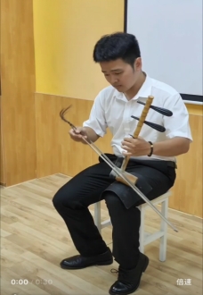 京胡《京郊行》,演奏者以娴熟精湛的演奏技巧,带动一位现场聆听的小男孩,不自觉的随着乐曲的高潮,脸上流露出充满笑意的表情。