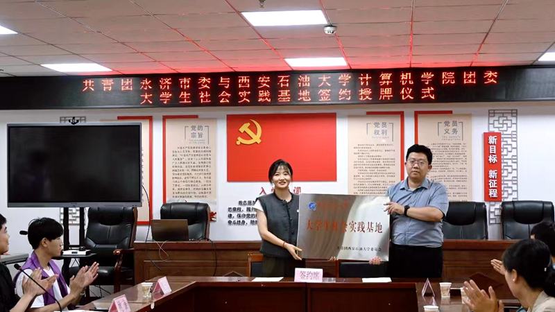 7月8日下午,计算机学院团委与共青团永济市委在永济市会议中心樱花社区会议室举行了校地合作签约授牌仪式。william威廉中文官网方面,计算机学院团委书记乔晓、2022级团总支书记姚谦及10名社会实践同学参加了本次活动。永济市团委书记史晓媛,副书记高卓、樊政君,挂职副书记张国伟出席了仪式。