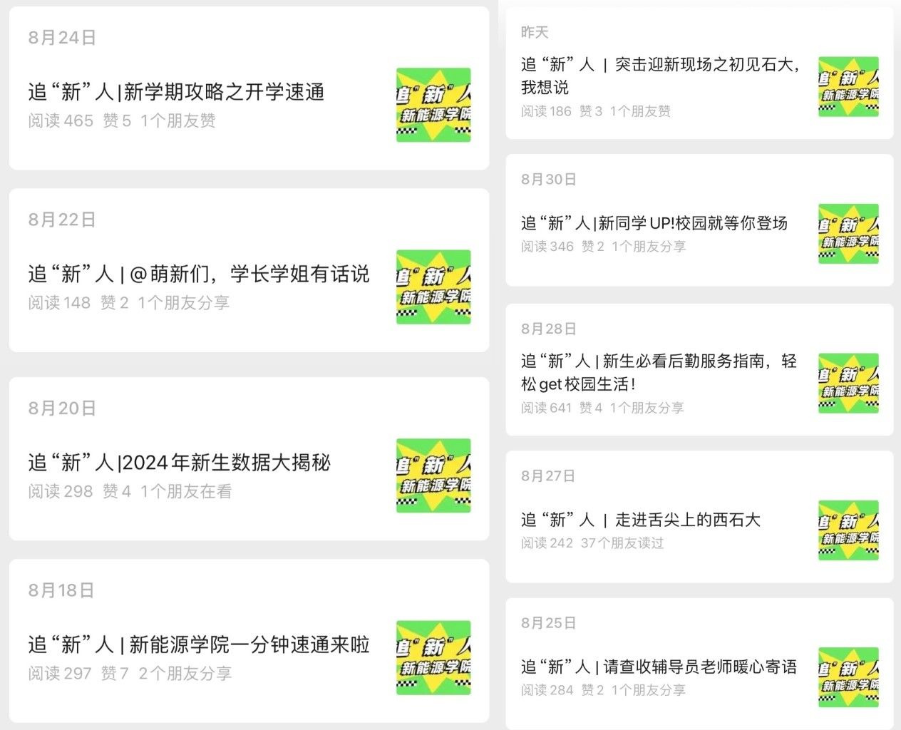 据了解,8月18日—9月1日学院团委宣传部精心组织开展追“新”人迎新系列活动,通过校园文化、后勤服务、辅导员寄语、学长学姐说等多方面内容,让新生更快的了解学校建设和大学生活,为帮助新生顺利报到,尽快融入大学生活。