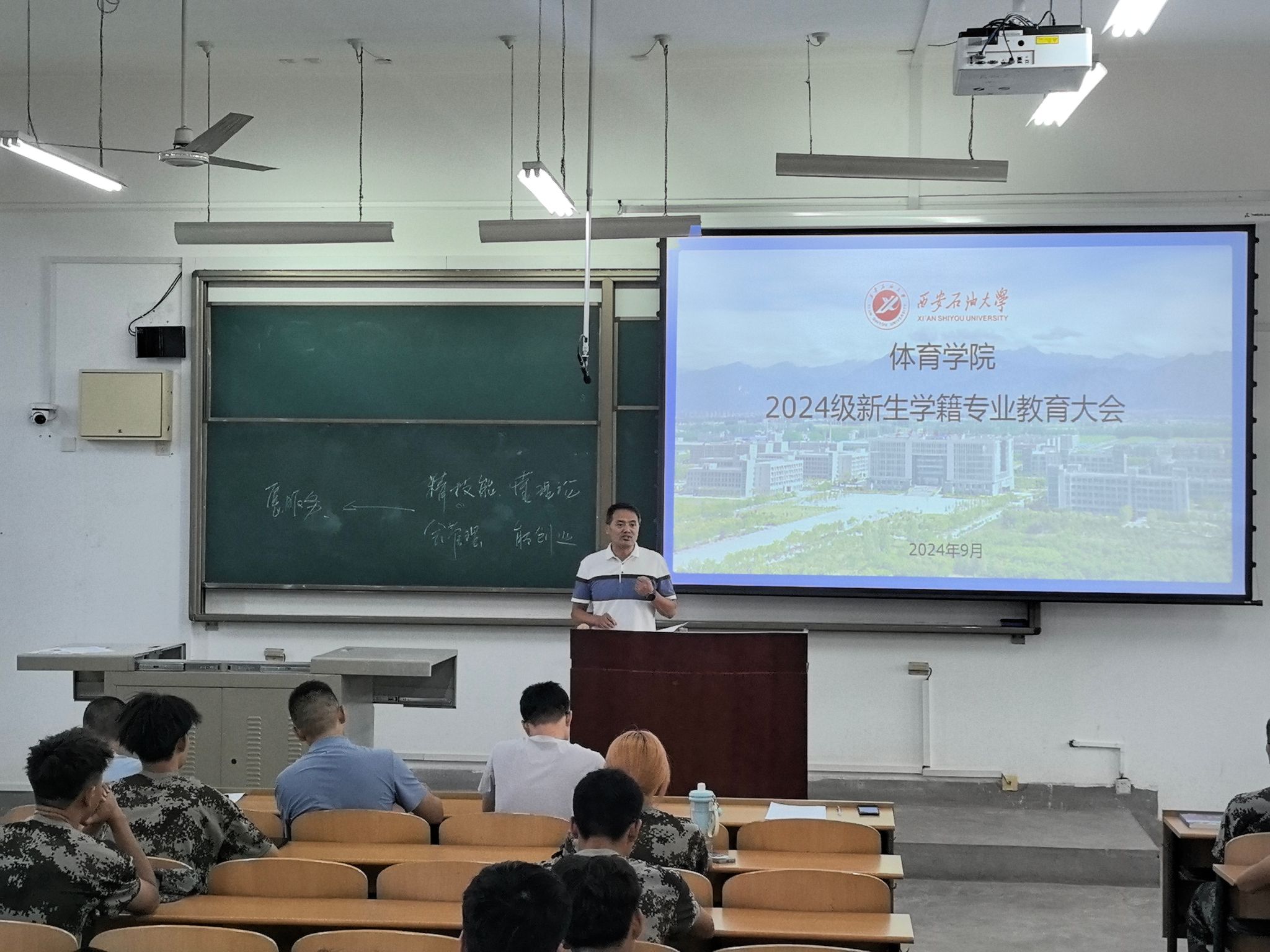 为指导和帮助2024级新生尽快了解和适应新环境,熟悉所学专业的培养目标、培养方式和毕业要求,更好地了解本科学生学籍管理条例、纪律处分条例及奖助条例,做好学业规划,快速适应大学学习,促进学风建设。9月8日下午,体院学院在鄠邑校区博思楼317教室召开2024级新生见面会暨学籍专业教育大会。学院党总支书记苟毅飞、院长李寿邦、社会体育指导与管理专业教研室主任胥山出席大会,会议由2024级新生辅导员张泽正主持。