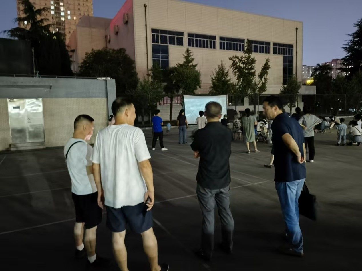 傍晚时分,华灯初上,社区工作人员与放映队的同志早早来到播放场地挂起幕布,调试好音响设备,晚上19:00观影正式开始,此次播放的影片是《浴血誓言》《我本少年》。前来观影的有年迈老者,也有活泼可爱的稚童,有辛劳一天的老师,也有刚用完晚餐的学子,大家聚集到一片星空之下,共同重温光影岁月。放映过程中,现场年龄大一些的观众一边看电影,一边聊起过去的故事,思绪被拉回到难忘的历史岁月。电影结束后有居民表示:“一场电影既拉近了师生居民之间的感情,又丰富了辖区文化生活,同时使思想教育更加生动有效,这个活动办得好。
