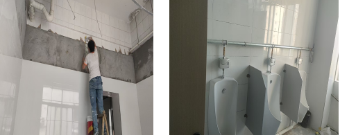 2.卫生间改造。为改善教学楼卫生间设施老化、渗漏水严重、卫生状况差、水压不足等问题,暑假期间对教学楼部分卫生间进行改造。主要改造内容为对卫生间地面、防水、小便器、洁具、上下水、排风、洗漱台等进行改造。本次共涉及卫生间9间。