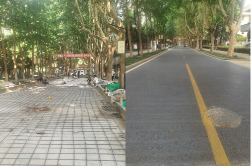 4.雁塔校区主干道路改造。雁塔校区主干道路面出现局部沉降、开裂,为保证行车安全。暑假期间,后勤处联系海绵工程项目部对有问题的路面进行维修加固。本次海绵项目部维修加固路面约700平方米。