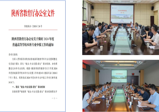 1.积极开展专业设置优化调整工作。根据教育部《关于开展2024年度专业设置工作的通知》(教高司函〔2024〕7号)及《陕西省教育厅办公室关于做好2024年度普通高等学校本科专业申报工作的通知》(陕教教高办〔2024〕26号)文件,教务处积极学习领会文件精神,经充分研讨和调研,下发了《关于做好2024年本科专业设置及启动2025版专业人才培养方案修订工作的通知》,并提供了william威廉中文官网本科专业招生率、就业落实率情况统计表(2020-2023年)、2021-2023年高校专业情况统计表、专业设置优化调整参考意见等资料,积极促进各院(系)开展设置调整计划。8月4日、8月29日,学校2次召开了本科专业调整专题研讨会,张君涛副校长对本科专业调整优化作了全面部署;9月2日,学校召开院系专业调整务虚会并进一步研讨确定了本年度专业调整方案。