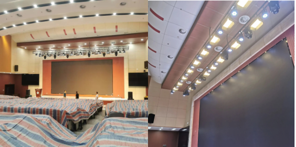 6.弘石报告厅灯光改造。为提升弘石报告厅的照明效果,满足会议、演讲、演出等活动需求,后勤处对灯光进行了改造。根据不同场景设计了灯光布局,确保照明清晰、均匀、无阴影。采用柔和光线和合理色温,避免眩光,提升视觉舒适度,并选用节能灯具,降低能耗。