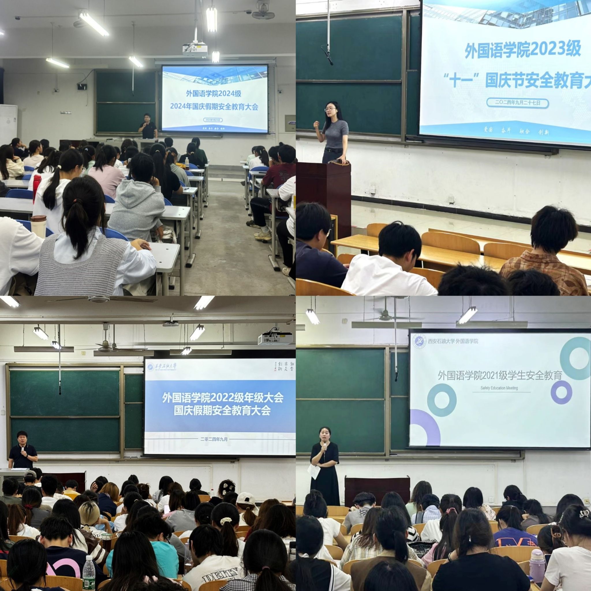 为提高学生安全意识,筑牢安全防线,落实学校和学院相关工作安排部署。近期,外国语学院各年级在鄠邑校区A316、A309、B121、B123、B112分别召开国庆节假期安全教育大会。