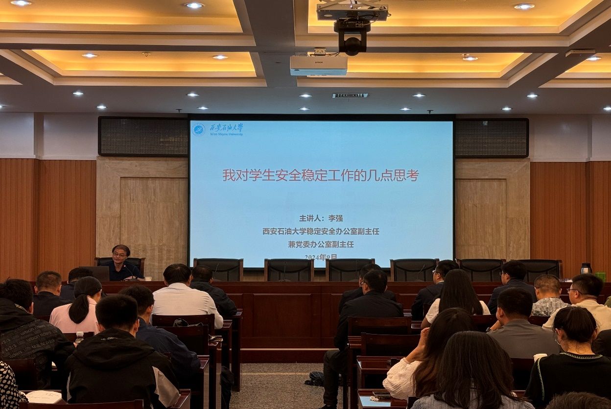 9月29日上午,学校稳定安全办公室副主任兼党委办公室副主任李强在鄠邑校区图书馆第一会议室作学生安全稳定工作专题培训,学校全体辅导员参加培训,学生工作部副部长毕轶慧主持会议。