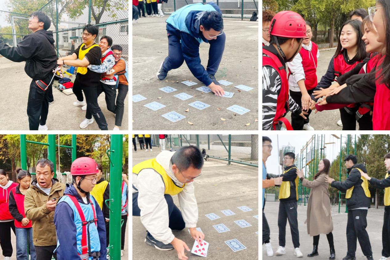 活动伊始,体育学院冀兆鹏老师对全体参训学生进行了动员,提出活动要求,明确活动目的,强调团队精神,通过一系列轻松有趣的破冰游戏,打破了彼此之间的陌生感,让大家在欢声笑语中逐渐熟悉起来。接着参与者们被分为若干个小组,每个小组都要在短时间内确定自己的队名、队徽和队歌等。这一环节充分激发了大家的创造力和团队协作精神,各小组纷纷发挥奇思妙想,展示出独特的风采。随后紧张有序的拓展活动逐一拉开帷幕。