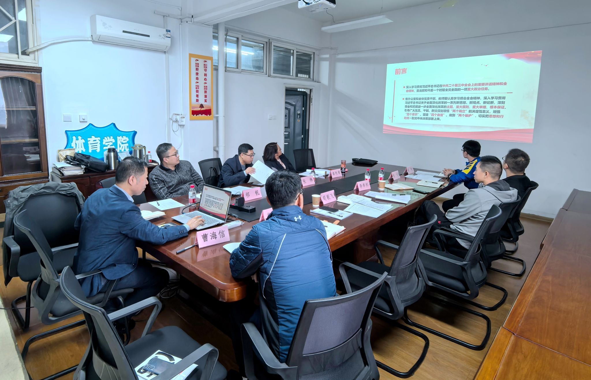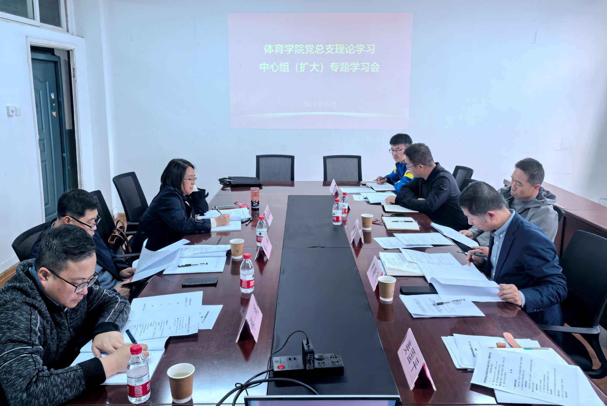 10月25日下午,体育学院党总支在雁塔校区华油能源楼733会议室召开理论学习中心组(扩大)学习会,认真学习习近平总书记重要文章《大力弘扬伟大爱国主义精神,把强国建设、民族复兴伟业不断推向前进》和习近平《论教育》相关篇目,以及习近平总书记给中国国际大学生创新大赛参赛学生代表的回信,并集体学习党的二十届三中全会精神。学校第三届党委第一轮校内巡察第二巡察组组长张伟和巡察组成员祁帆、秦秋菊列席会议。学院理论学习中心组成员及相关办公室主任参加会议,会议由学院党总支书记苟毅飞主持。