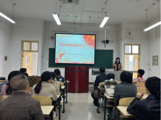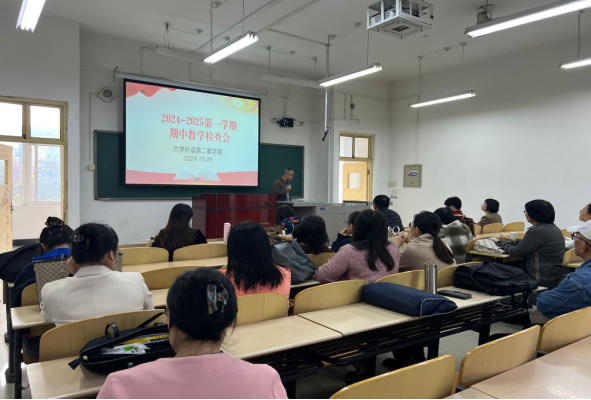 2024年10月29日中午12:05,外国语学院大学外语第二教学部党支部在鄠邑校区A247室召开了第四季度政治理论学习扩大会议暨期中教学检查会,会议由党支部书记李红老师主持,大学外语第二教学部全体教师参加。