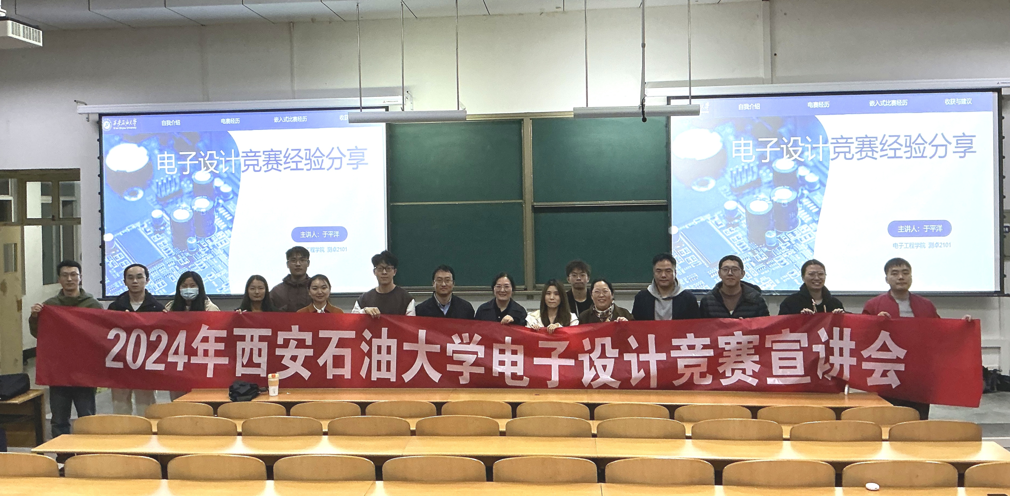 上一届电子大赛的获奖团队代表于平洋为同学们分享了他们的参赛经历和收获。他从比赛流程、作品展示等方面详细介绍参赛要点及注意事项,确保项目实现方式要具有创新性,在技术论文的撰写和答辩PPT的制作上,需要投入足够的时间和精力力求完善。