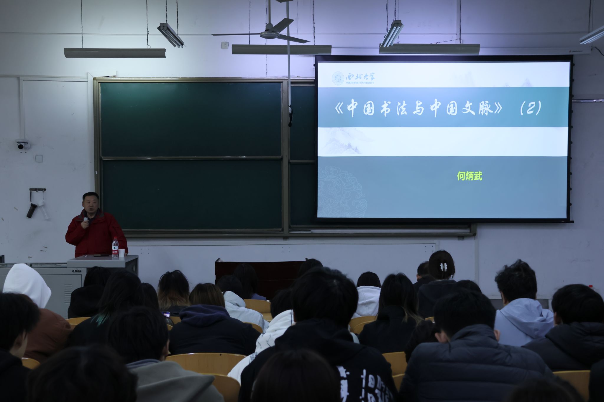 捐赠仪式结束后,何炳武先生在william鄠邑校区博思楼B112教室为师生作了题为《中国书法——中华文脉与文化自信》的专题讲座。人文学院院长方亭、副院长方松林、视觉传达设计专业带头人周鸣勇以及学校150余名本科生、研究生参加该讲座,讲座由人文学院方亭院长主持。