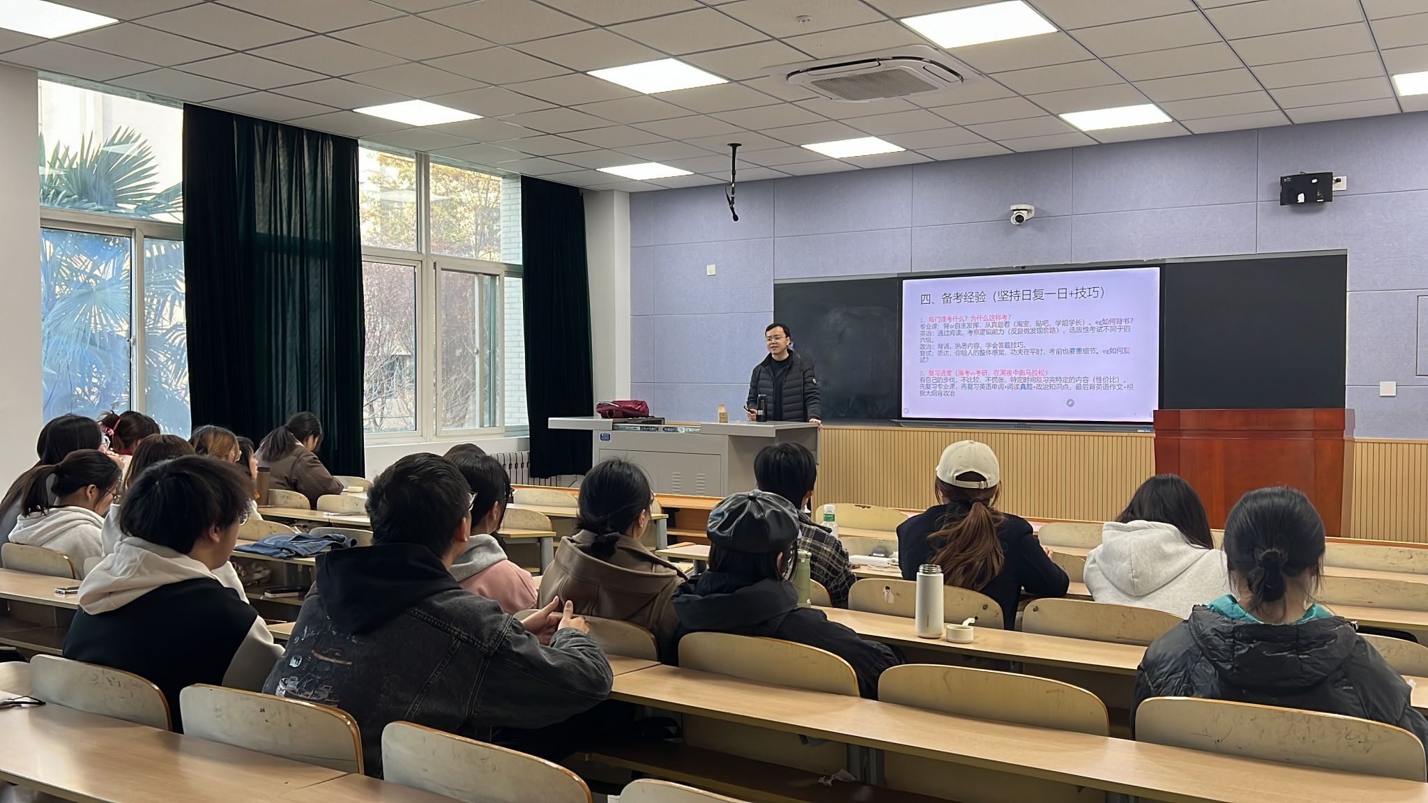 静老师围绕考研的关键要素进行了深入分享。在考研流程方面,详细介绍了院校专业选择、报名注意事项,初试、复试的环节及时间节点,使同学们对考研的整体框架有了清晰的认识。之后,静老师结合自身学习经验,给同学们分享复习背诵技巧,为同学们提供了系统且实用的方法,强调理解记忆与重复记忆相结合,通过构建知识框架、巧用记忆卡片等方式提高背诵效率。此外,静老师还着重强调了合理安排复习时间的重要性,建议同学们制定科学的学习计划,平衡好各科目的复习进度,避免前期松懈、后期紧张的情况出现,同时也要注意劳逸结合,保持良好的学习状态。