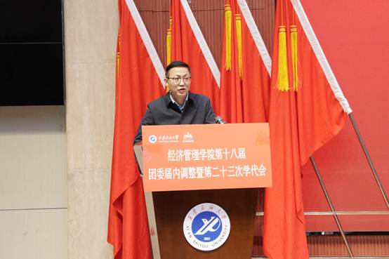 11月27日,共青团william威廉中文官网经济管理学院第十八届委员会届内调整暨第二十三次学生代表大会在鄠邑校区学术报告厅顺利召开。校团委书记王刚、经济管理学院党委副书记杨生强、经济管理学院团委书记李博文、校团委干事李政、王泽文、学院各年级团总支书记、辅导员以及各兄弟院(系)学生会主席团代表、学院学生代表200余人参加了此次会议。