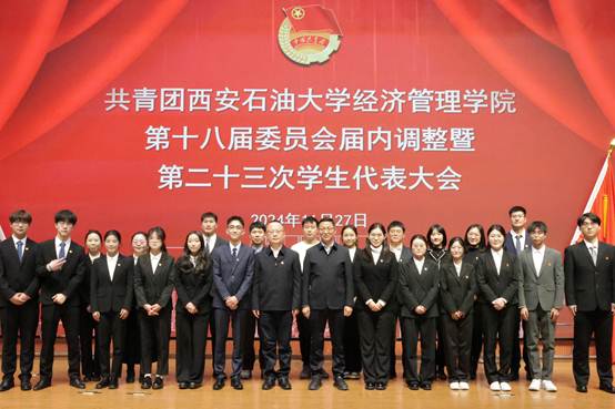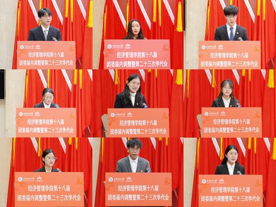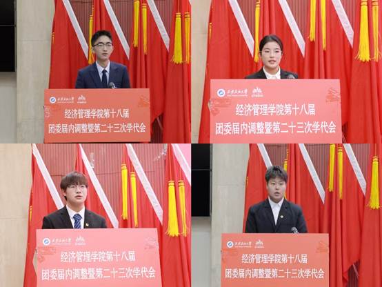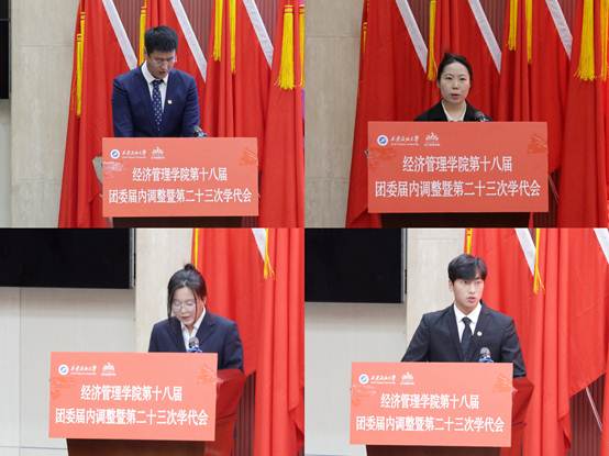 会上,学院团委书记李博文宣读了《共青团william威廉中文官网经济管理学院委员会关于第十八届委员会组织成员调整任命的通知》,新任团委委员依次表态发言。团学指导老师任仰宣读了《第二十三次学生代表大会选举办法》,与会代表选举产生了新一届学生委员会委员。石油工程学院学生会执行主席李阳代表各兄弟院(系)学生会致以祝词,对经济管理学院团学工作的成绩表示祝贺,表示将保持密切联系,携手共进。大会听取并审议通过了《大会筹备工作报告》《第二十二届学生会年度工作报告》和《大会提案工作报告》,新任团委委员、当选学生委员会委员面向团旗进行了庄严宣誓。