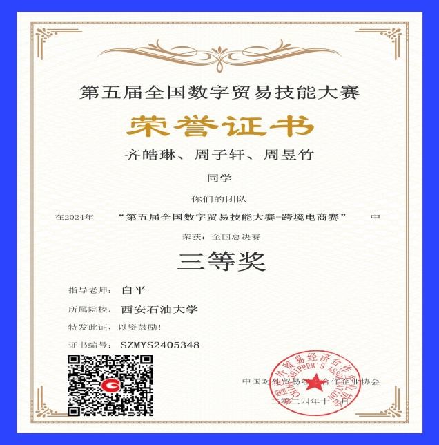 2024年11月20日-11月24日,由中国对外贸易经济合作企业协会主办,南京步惊云软件有限公司承办的“第五届全国数字贸易技能大赛跨境电商赛项”成功举办。来自全国217所本科、高职、中职院校的3592支队伍共计10776人参加了比赛,其中中职组232支队伍,选手696人;高职组1251支队伍,选手3753人;本科组2109支队伍,选手6327人。经过五天的激烈角逐,由白平老师指导的1支参赛队伍在本次比赛中荣获全国三等奖。