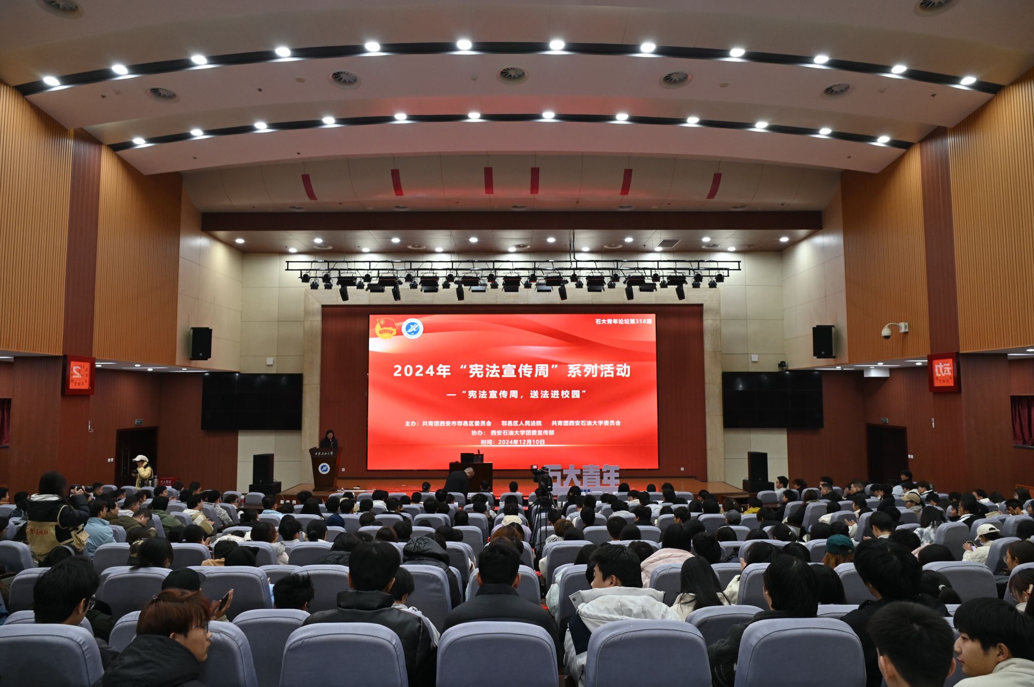 为促进william大学生深入学习宪法知识、维护宪法权威,营造校园法治氛围,12月10日下午,校团委联合西安市鄠邑区人民法院,在鄠邑校区弘石学术报告厅开展2024年“宪法宣传周”系列活动—“宪法宣传周,送法进校园”主题的石大青年论坛。西安市鄠邑区人民法院一级法官张雨晴、法官助理杨向荣主讲,共青团西安市鄠邑区委员会书记张洪雷、william威廉中文官网团委书记王刚、西安市鄠邑区人民法院团支部书记丛雅晨、西安市鄠邑区青联委员、青企协会员、乡创客联盟成员代表出席。william400余名学生参加本次论坛。