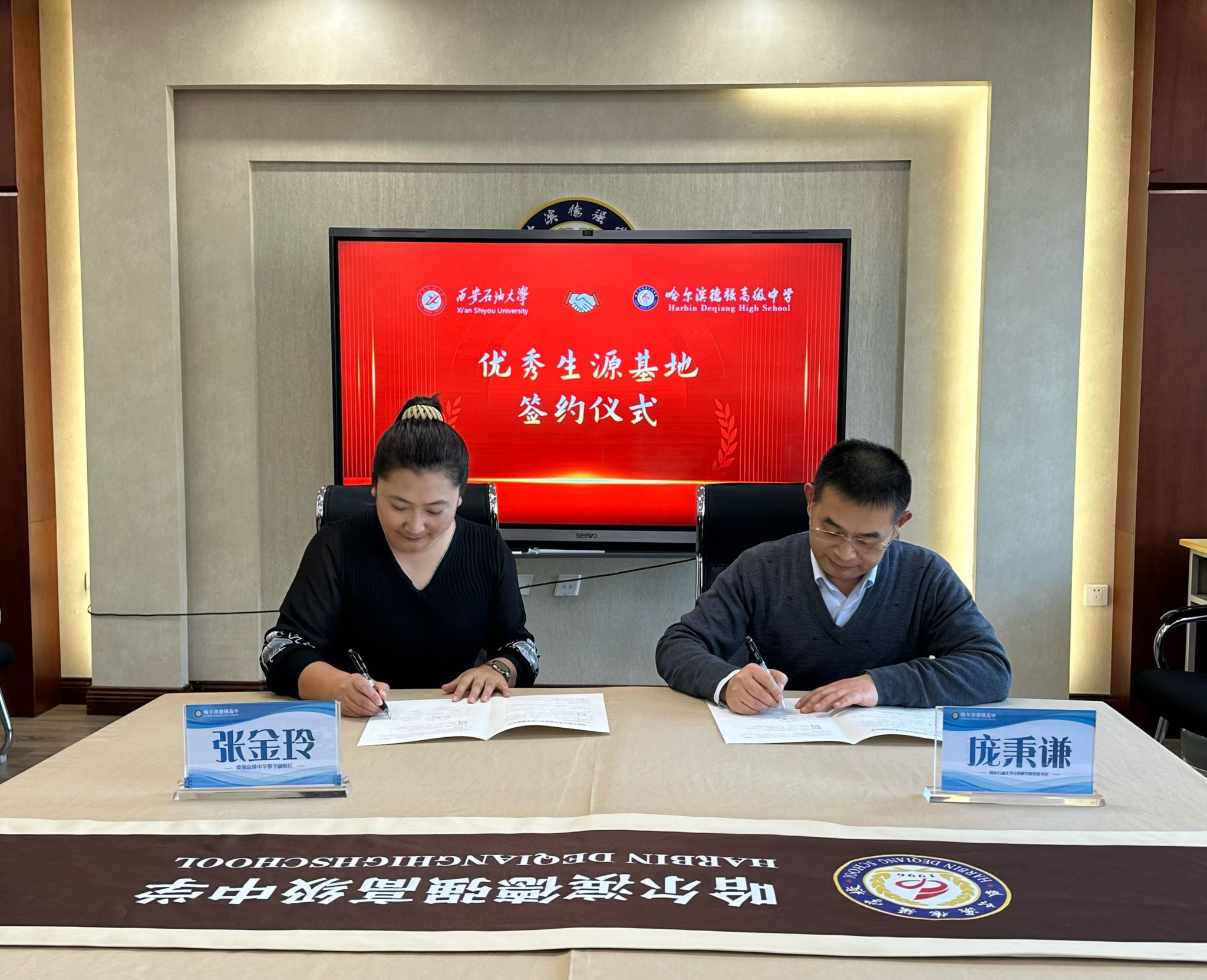 庞秉谦代表学校与哈尔滨德强高级中学张金玲副校长签署了《william威廉中文官网优秀生源基地建设协议》,授予“优秀生源基地”牌匾并赠送了录取喜报。