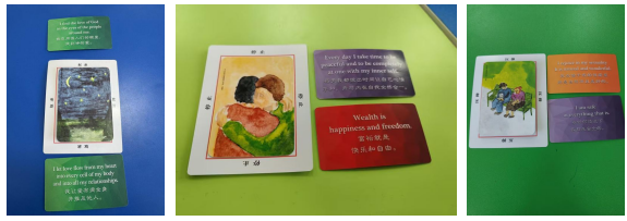 本次活动主题为“卡牌心桥—与自己对话”,意在通过欧卡牌让同学们更深入、更直观地感受到自身心理映射和情绪体验,并通过交流分享,助力大家避免压抑、开放身心。活动开始,同学们随机分为三个小组,李夏凝让每位同学以动物自比,帮助大家初步了解个人性格和特质。随后,进行欧卡牌团训,同学们分四次分别抽取彩虹卡、图卡、字卡、彩虹卡,并围绕卡牌内容、选择理由、自身感受等进行分享。最后,李夏凝邀请有分享意愿的同学进行发言,讲述自身体会,并以此为衍伸,鼓励同学们在生活中要敢说、想说、多说,及时表达自我,避免因憋闷、钻牛角尖等形成不好的情绪体验。整个活动氛围亲切、温馨,同学们纷纷表示体验感极佳,也通过本次活动在一些问题上有了新的认识,更清楚了内心深处的想法。
