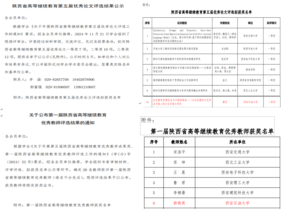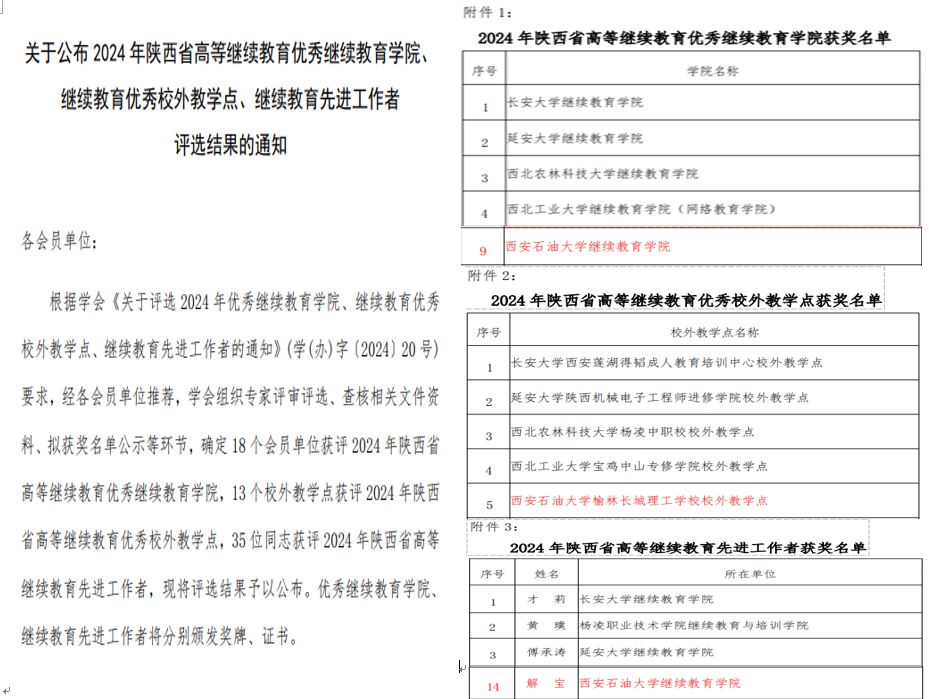 近日,在陕西省教育厅指导下、陕西省高等继续教育学会组织实施的两年一次的各类评比评选中,william继续教育工作获得多项荣誉表彰。在“2024年陕西省高等继续教育优秀继续教育学院、继续教育优秀校外教学站点、继续教育先进工作者”评选中,william继续教育学院(培训中心)荣获“陕西省高等继续教育优秀继续教育学院”,william榆林长城理工学校校外教学点获得“陕西省继续教育优秀校外教学站点”,继续教育学院(培训中心)解宝荣获“陕西省高等继续教育先进工作者”称号;在“陕西省高等继续教育第五届优秀论文”评选中,继续教育学院(培训中心)解宝获得优秀论文二等奖;在“陕西省第一届高等继续教育优秀教师”评选中,马克思主义学院郭艳英荣获“陕西省高等继续教育优秀教师”称号。