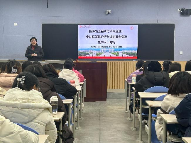 12月24日上午,外国语学院在鄠邑校区博览楼A219启动2026届考研动员系列讲座,本次邀请学院MTI翻译硕士教学中心陈柯教授面向翻译专业学生开展专题讲座,学院60余名学生参加。
