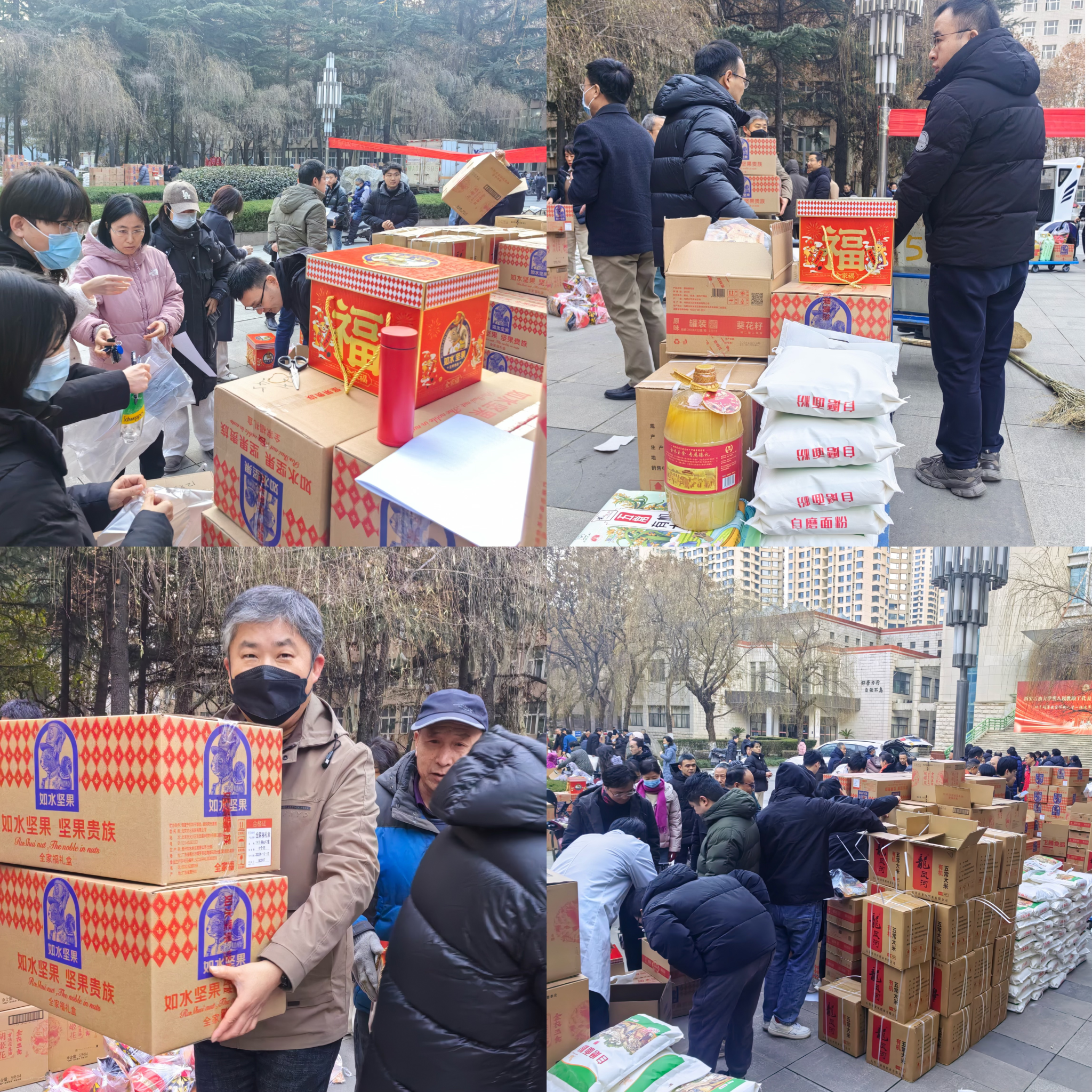 为切实贯彻刚刚闭幕的八届教代会和九届工代会会议精神,传递学校对广大教职工的深切关怀与诚挚谢意 ,助力全校教职工度过一个欢乐、祥和的寒假与春节,1 月 14 日,校工会于雁塔校区忠实广场开展了节日福利发放活动,为辛勤工作在各个岗位上的教职工们送上衷心慰问、深切关爱以及新春佳节的美好祝福。