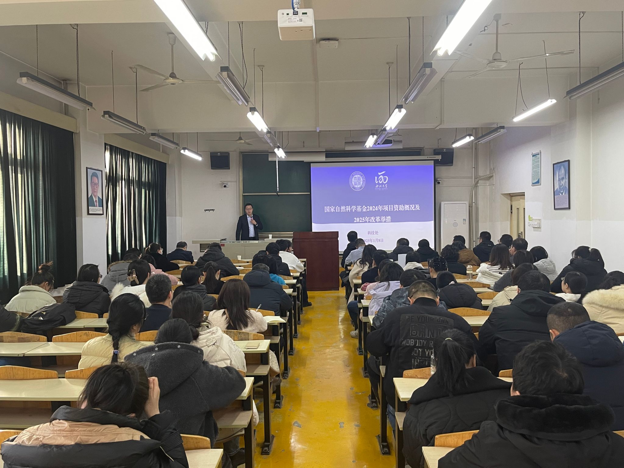 为持续做好2025年度国家自然科学基金申报工作,进一步提升国家基金申报质量,继续推动有组织科研工作,1月14日下午,西北大学科学技术处处长、现代物理研究所杨涛教授应邀在william第二教学楼1107室作了题为“国家自然科学基金2024年项目资助概况及2025年改革举措”的报告。科研处全体成员、各院科研副院长、科研办公室主任(秘书)、教师代表等100余人参加报告会。会议由科研处处长张益主持。