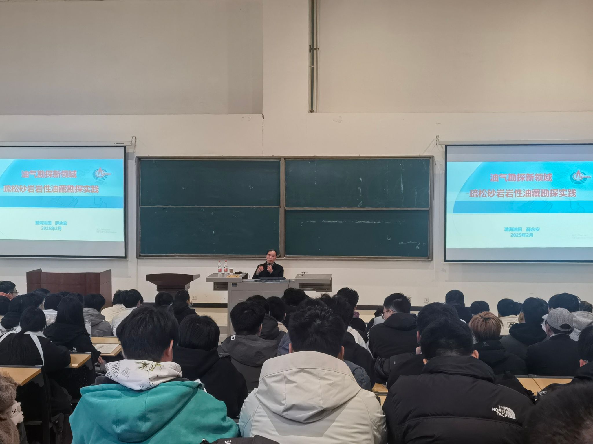 薛永安教授首先分享了自己近40年的油气地质科研经验,而后以渤海油田源外构造空白区新生界疏松砂岩岩性油藏勘探重大突破及系列理论创新为切入点,鼓励同学们在学习中秉承脚踏实地、大胆假设、小心求证的原则,守正创新,努力成为未来我国能源领域顶得上、接得住的中坚力量。讲座现场气氛热烈。