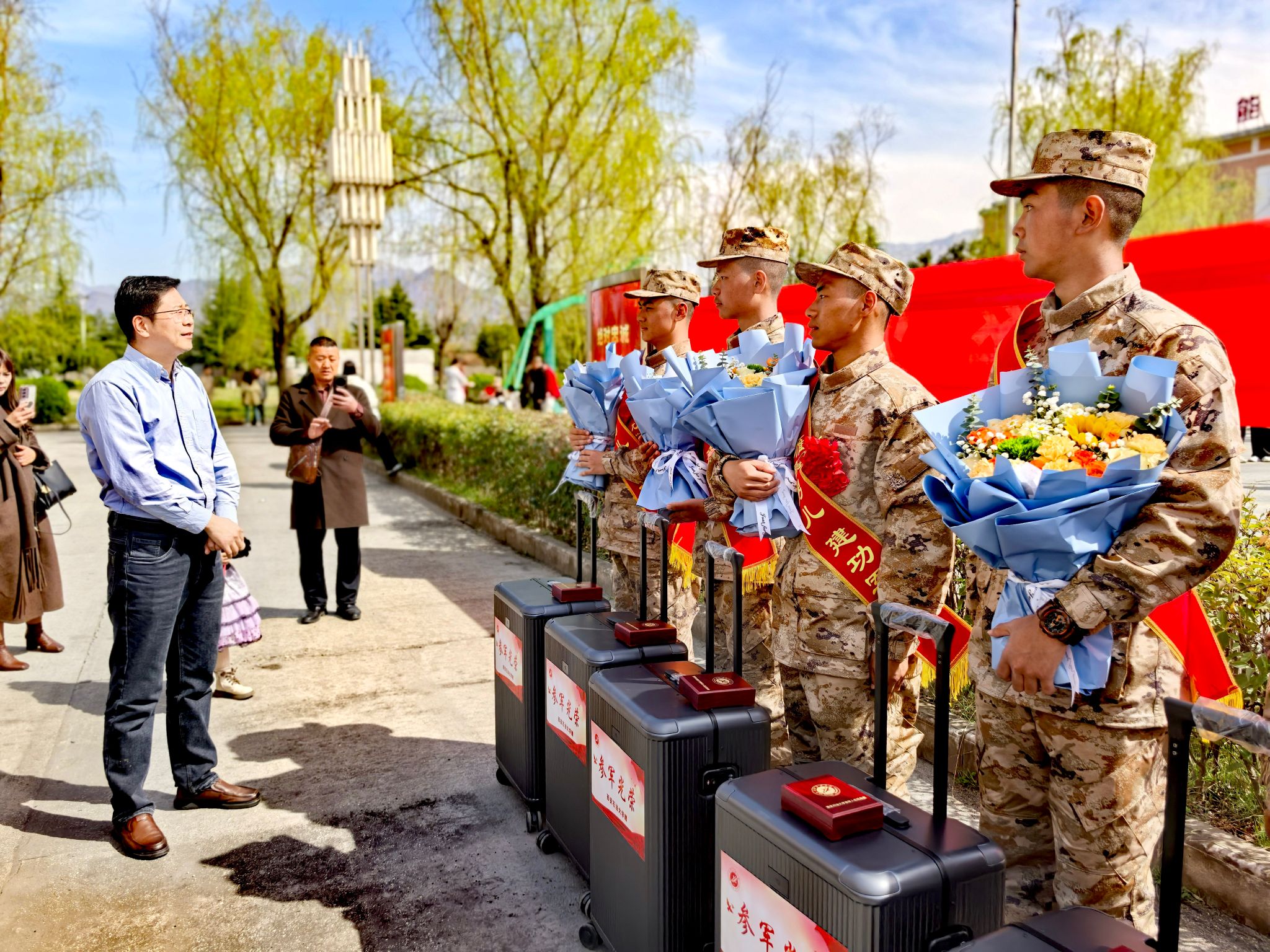 仪式现场,学校为每位入伍学生送上了精心准备的行李箱、纪念胸章、鲜花“青春报国三件礼”,6名学子庄严敬礼。仪式结束后,在场教师、家长、入伍学生进行合影留念,并与入伍学生挥手告别。