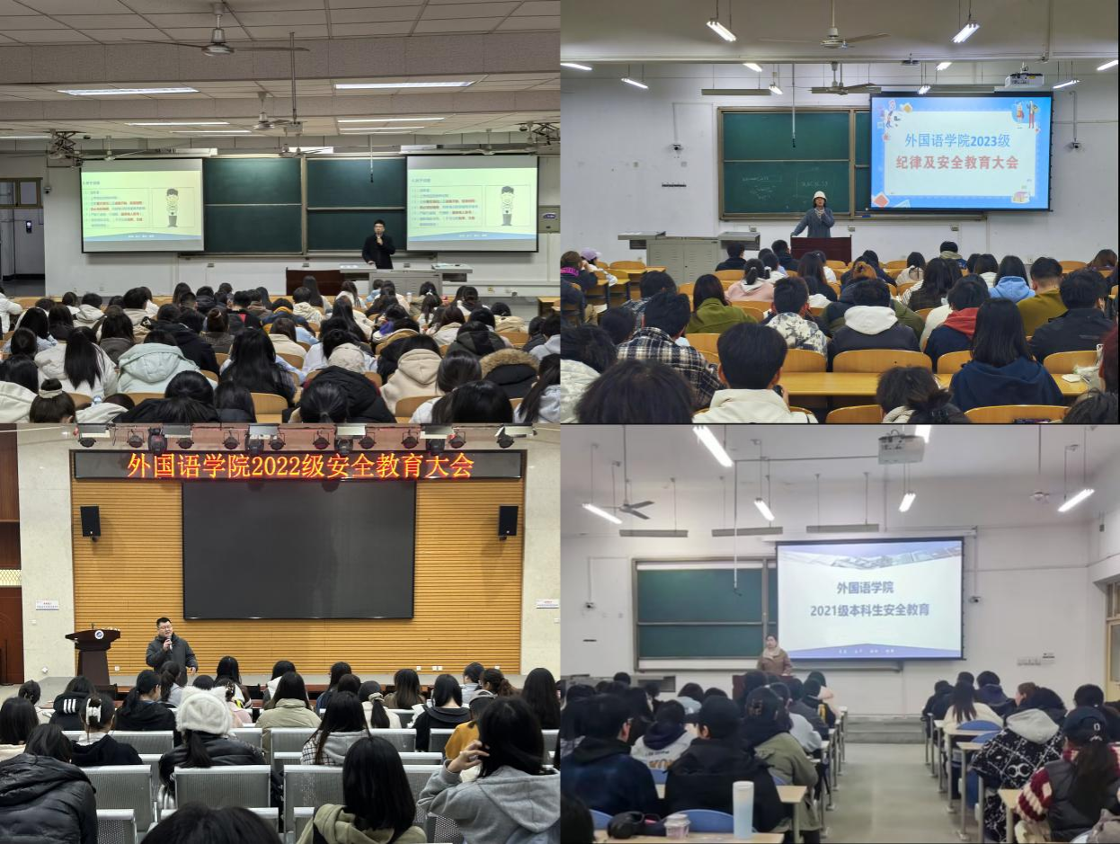 为落实《关于开展纪律教育学习宣传月活动的通知》(学工函〔2025〕3号)文件要求,切实增强全体在校学生的纪律意识,提升法治素养,努力营造一个风清气正、秩序井然、和谐美好的校园环境,确保校园安全稳定。根据学校统一安排部署,外国语学院各年级于3月10日至13日分别在鄠邑校区博思楼B114、崇文楼118召开安全教育大会,会议由各年级辅导员主持。