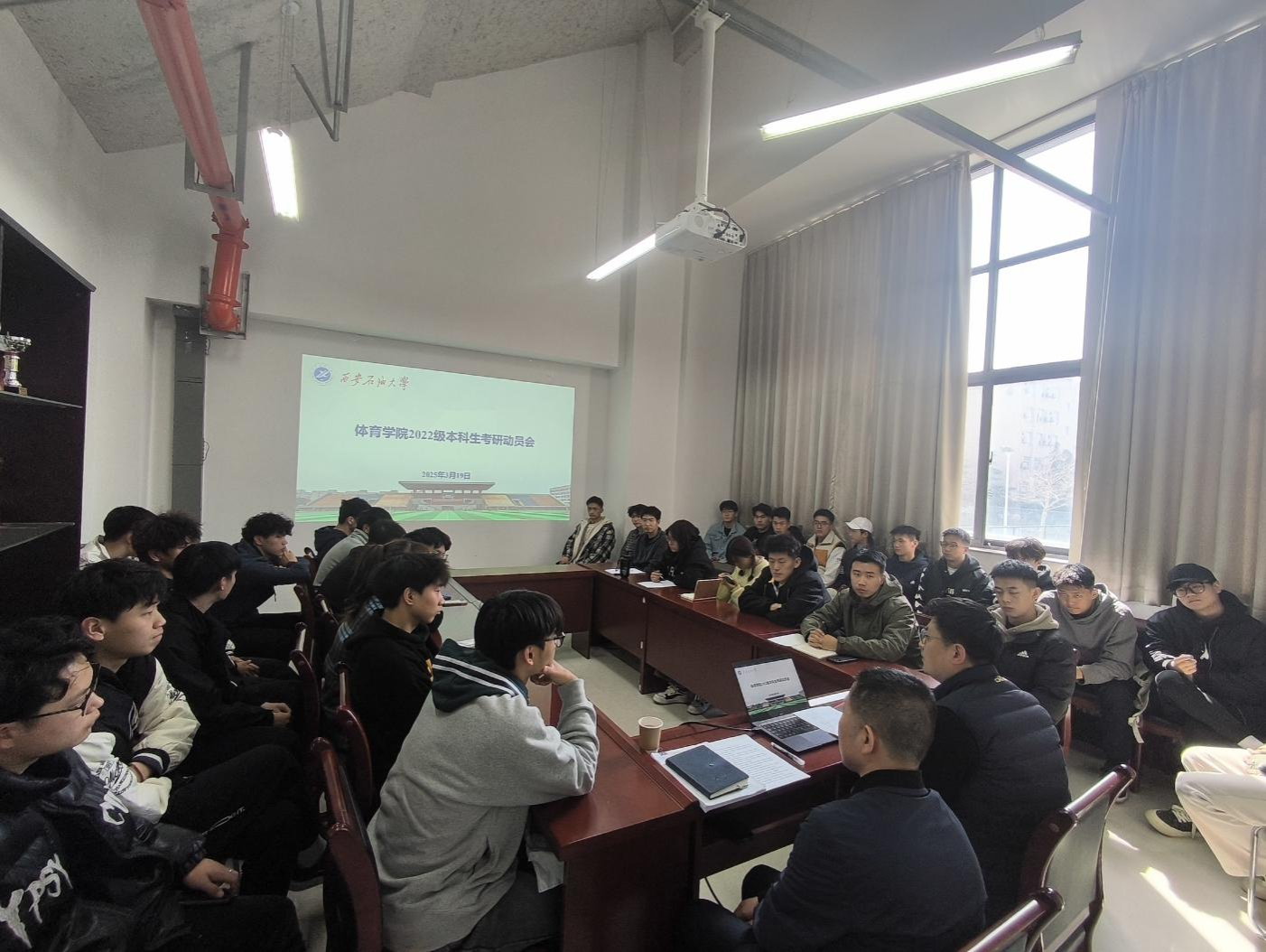 为进一步充分调动同学们的考研积极性,坚定考研决心,增强考研自信心,更好地挖掘自身潜能,把握深造机会,体育学院在前期对有考研意向学生进行摸底的基础上,于3月19日下午在鄠邑校区东体育场体育学院208会议室召开2022级学生考研动员暨指导会。体育学院党总支书记书记苟毅飞出席会议。2022级学生参加会议。会议由学工办主任姜国平主持。