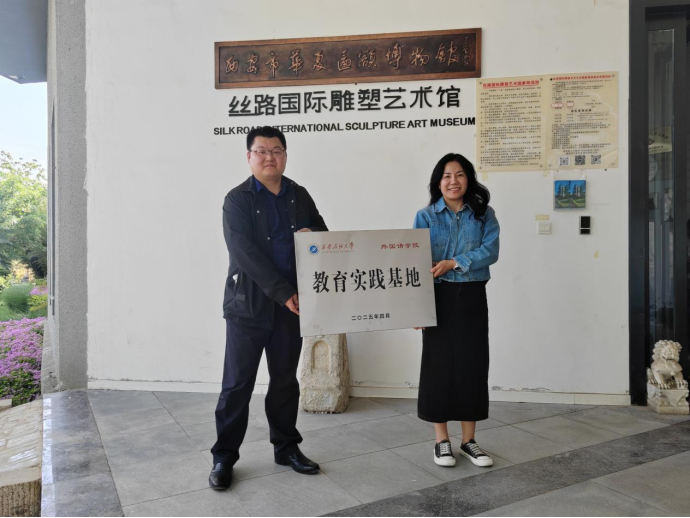 张建高、邱岭与丝路国际雕塑文化艺术园负责人热切交流。在交流中,双方就合作的方向、内容以及未来的发展规划等进行了深入探讨,在大家的共同见证下,外国语学院在丝路国际雕塑文化艺术园教育实践基地正式挂牌。