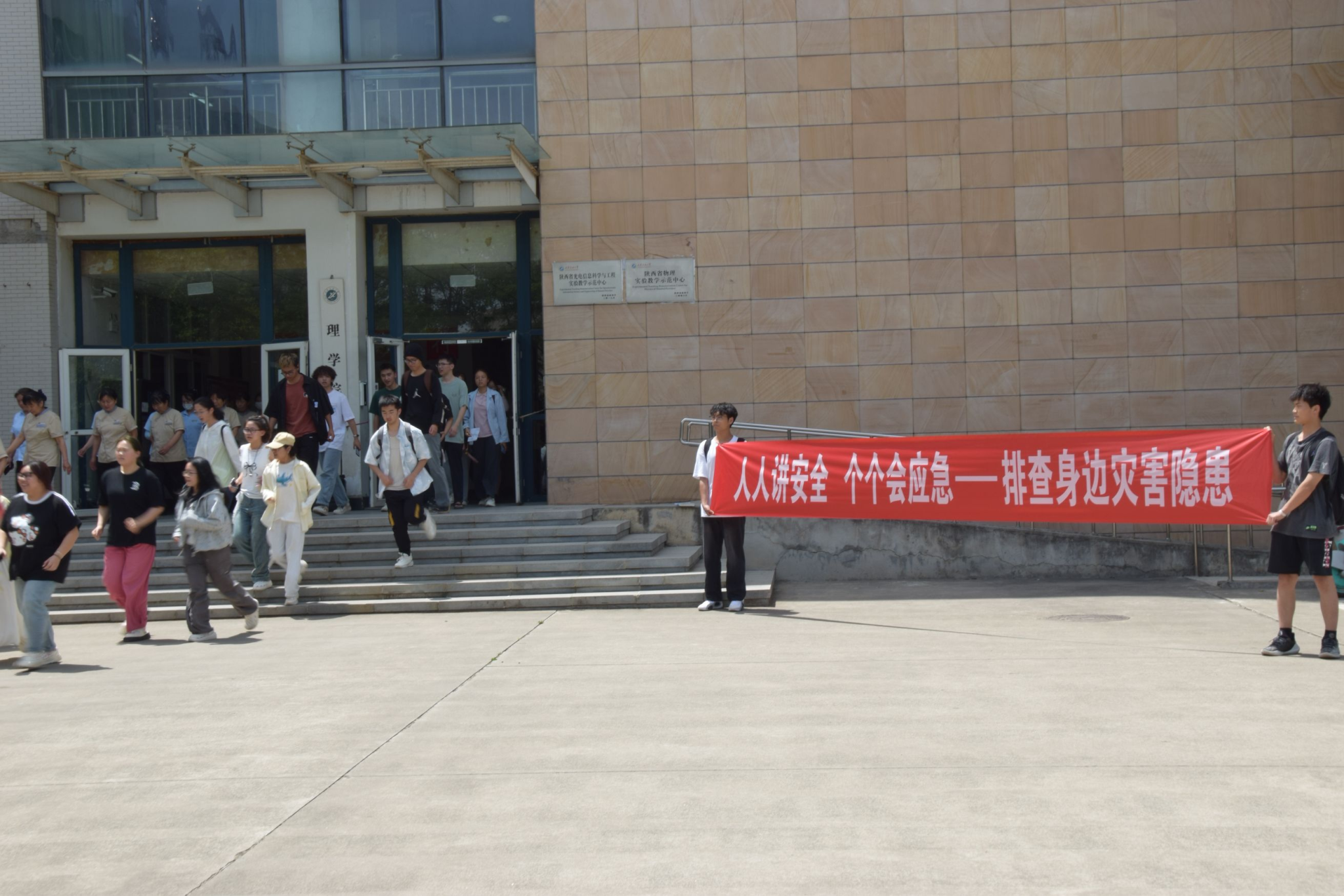 为全面提升学生应对突发灾害的应急能力,强化安全防范意识,5月12日中午,学生工作处、保卫处、理学院在鄠邑校区志远楼举行疏散逃生演练。学生工作处副处长马小刚、保卫处副处长王业青、理学院党委副书记杨富民,理学院2023级、2024级本科学生,理学院全体学工干部及物业公司代表500余人参加本次演练活动。