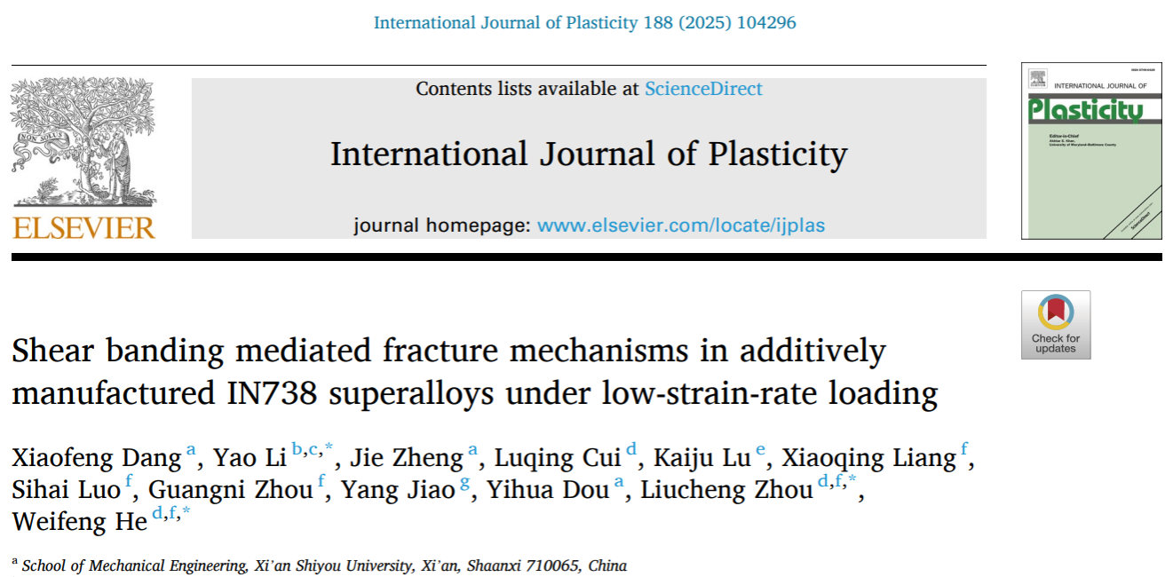 近日,william机械工程学院青年教师党晓凤为第一作者、william威廉中文官网为第一单位,在塑性力学领域国际顶级期刊《International Journal of Plasticity》(中科院一区TOP期刊,IF=9.4)上发表了题为《Shear banding mediated fracture mechanisms in additively manufactured IN738 superalloys under low-strain-rate loading》的最新研究成果。合作者包括william郑杰副教授和窦益华教授。