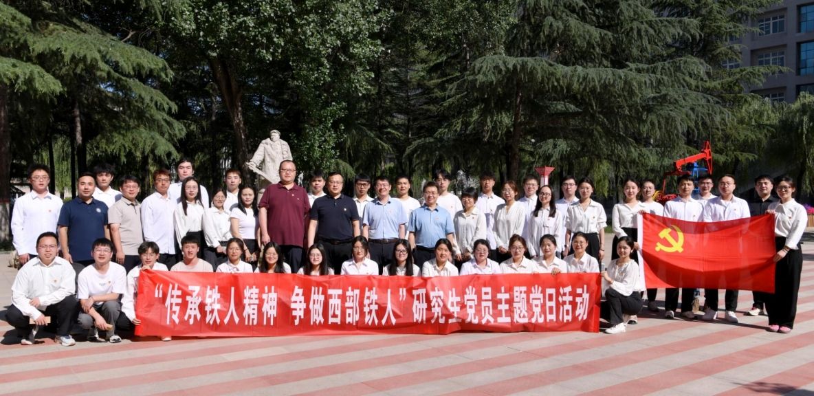 最后,学院党委书记高小明给大家讲述了一堂微党课。他讲到,在铁人广场的铁人雕像前,举办“传承铁人精神 争做西部铁人”研究生毕业班党员主题党日活动,既是对铁人精神的崇高致敬,也是对我们即将踏上新征程的毕业班党员的一次深刻党性教育。铁人王进喜,这位新中国石油工业的奠基人,以他“有条件要上,没有条件创造条件也要上”的豪迈气概,为我们树立了不朽的丰碑。他的爱国情怀、创业精神、求实态度和奉献精神,构成了铁人精神的丰富内涵,激励着一代又一代石油人不断前行。今天,师生齐聚在这里,重温入党誓词,就是要铭记初心,牢记铁人为人民服务的宗旨,将铁人精神内化于心,外化于行。他对全体毕业班党员提出三点希望:一是要传承铁人精神,坚定理想信念。铁人精神的核心是爱国和奉献,是面对困难和挑战时的不屈不挠。作为新时代的青年党员,要时刻牢记自己的初心和使命,将个人的理想追求融入到国家和民族的事业中去,为实现中华民族伟大复兴的中国梦贡献自己的力量。二是要勇担时代责任,争做西部铁人。服务国家能源战略,是我们石油人义不容辞的责任。学院大部分同学选择了在西部就业、在能源领域就业,希望大家继承和发扬“铁人精神”,牢记“将能源的饭碗牢牢的端在自己手里”,不畏艰难,勇于担当,成为能源战线上的主力军。三是要持续学习进步,发挥示范引领。希望大家在学中干、在干中学,养成终身学习的好习惯。每一名党员要牢记自己的身份和责任,发挥党员先锋模范作用。要传承铁人精神,争做西部铁人,用实际行动书写属于青年学子的精彩篇章!