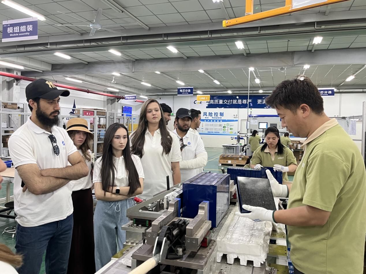 随后,留学生们走进生产车间,实地观摩了电芯分选、模组组装、BUSBAR焊接、PACK组装等核心生产环节。现代化的生产设备、精湛的工艺技术以及严谨的质量管控流程,让留学生们赞叹不已。他们纷纷驻足观察,并与现场工程师就技术细节和生产效率等问题展开了交流讨论。