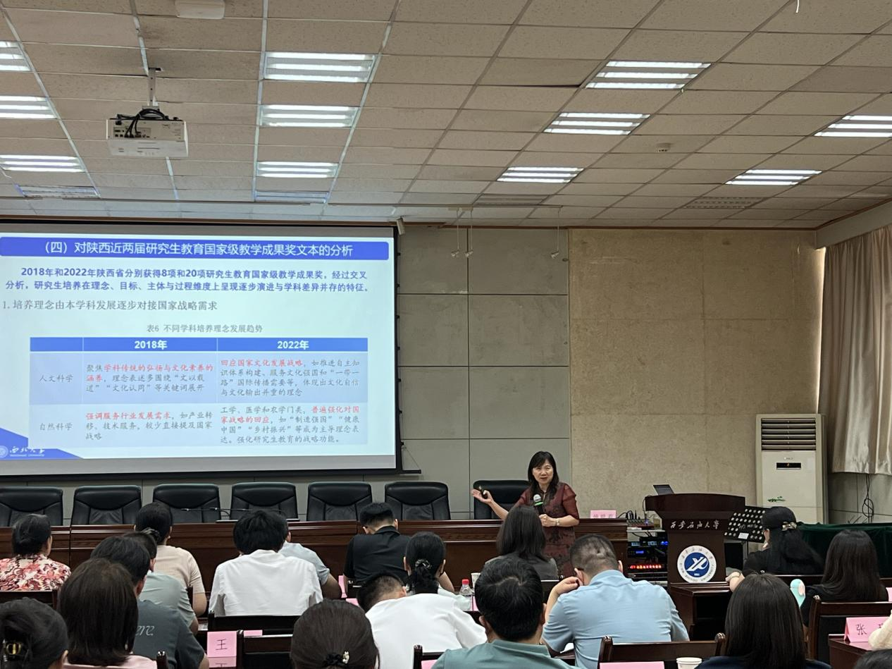 西北大学姚聪莉教授以《教学成果奖的词云分析及成果培育》为题,首先从培养理念、目标、主体和过程四个视角,对前三届国家级教学成果奖做了词云分析,梳理出人才培养范式的基本特征和变化趋势。进而围绕教学成果奖的内涵特征、培育路径、申报书撰写与成果凝练、申报注意事项等方面进行了系统讲解。她强调,教学成果应体现鲜明的时代特征、突出的问题导向与创新意识,同时应在理论高度、实践基础与应用成效上实现有机统一。成果培育要聚焦关键问题、破解改革难题,注重数据支撑和以学生为中心的成果提炼原则。并建议尽早谋划,集结力量开展协同攻关,整合资源、打造优势互补的团队,实现科研反哺教学,推动高质量成果产出。