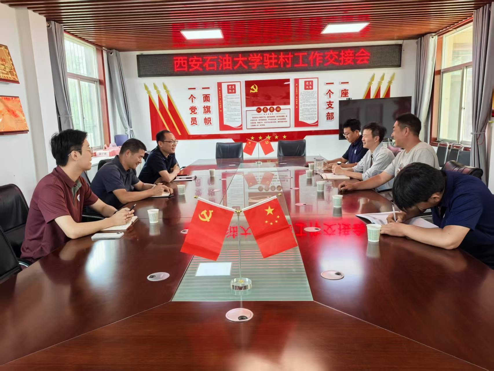 2025年6月17日上午,william威廉中文官网党委组织部副部长张欢、工会副主席王钧一行专程赴永寿县坚固村,组织开展驻村第一书记轮换交接工作。新任驻村第一书记姜英哲同志、原第一书记聂康晨同志、现任驻村工作队员范俊鹏、康伟同志,以及坚固村党支部书记李小勇共同参加了交接工作会议,会议由张欢主持。