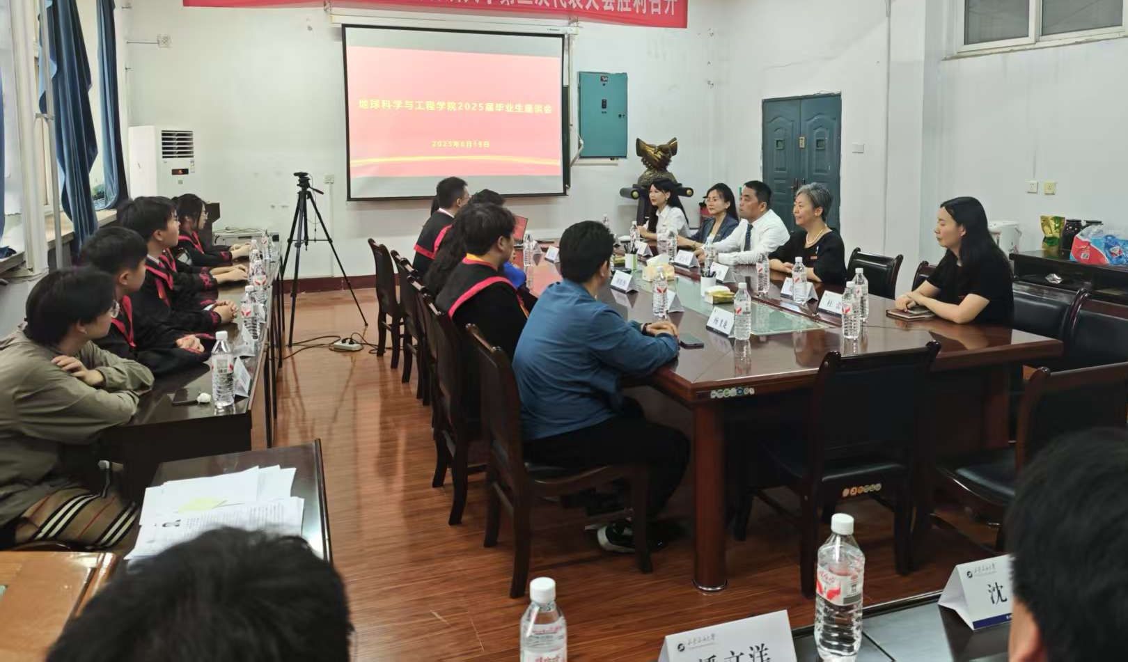 为倾听毕业生心声,共话学校和学院发展,2025年6月19日,地球科学与工程学院在雁塔校区1号实验楼206会议室召开2025届毕业生座谈会。学院党委书记高黎、院长宋立军、党委副书记王莹、教师代表杨飞龙、学工办主任姜楠、2025届本科毕业班辅导员贺大川、2025届研究生毕业班辅导员杜蕾及学院2025届毕业生代表们齐聚一堂,畅谈成长感悟,展望未来征程。