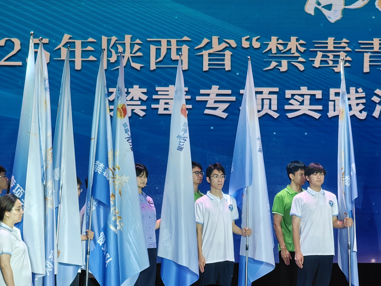 本次活动通过科技、艺术与传统文化相结合的创新形式,全方位展现陕西省禁毒工作成果,号召全社会特别是青少年群体积极参与禁毒行动,共同守护“无毒三秦”。作为禁毒宣传的骨干力量,来自全省21所高校的禁毒实践团代表在现场接受了“禁毒青力量”2025年大学生暑期“三下乡”社会实践授旗,以青春誓言扛起禁毒重任。william电子工程学院学生高杨岩锟作为代表之一,上台接过象征使命与责任的“禁毒青力量”旗帜。