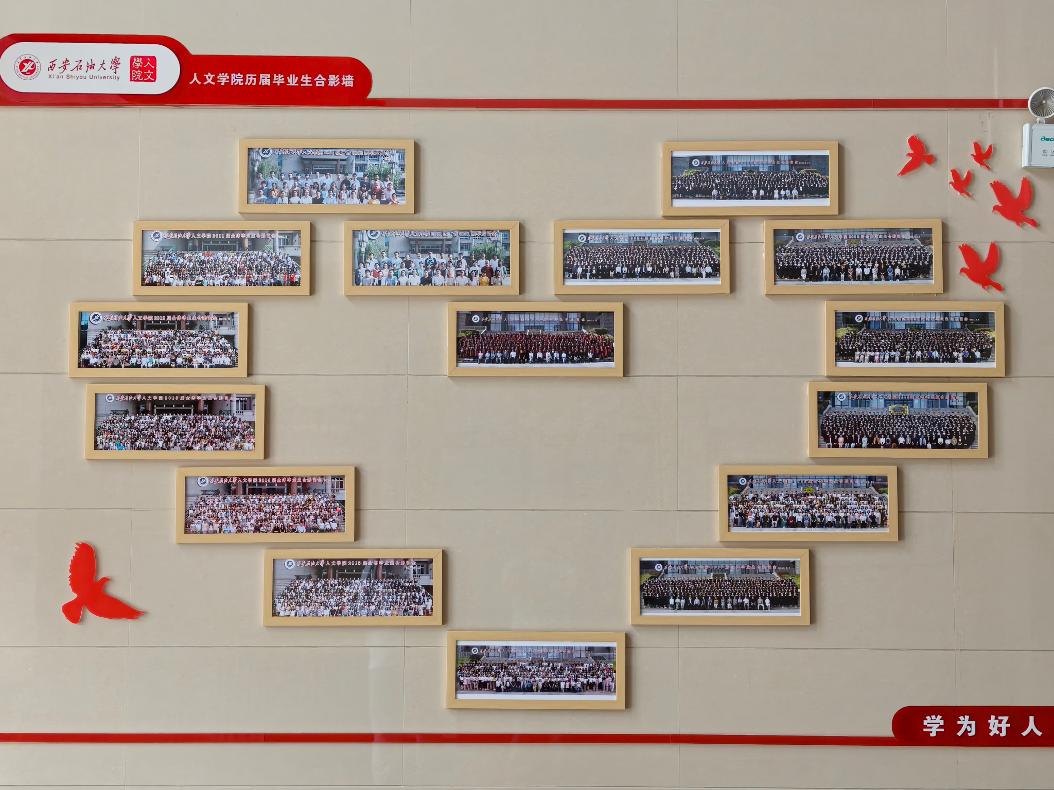 为营造温馨浓郁的“校友回家”氛围,迎接即将到来的秩年返校活动,人文学院精心策划制作了一面满载历史记忆的历届毕业生合影照片墙。7月6日,这面饱含深情的照片墙在鄠邑校区崇文楼南门布置完毕,静待校友们归来。