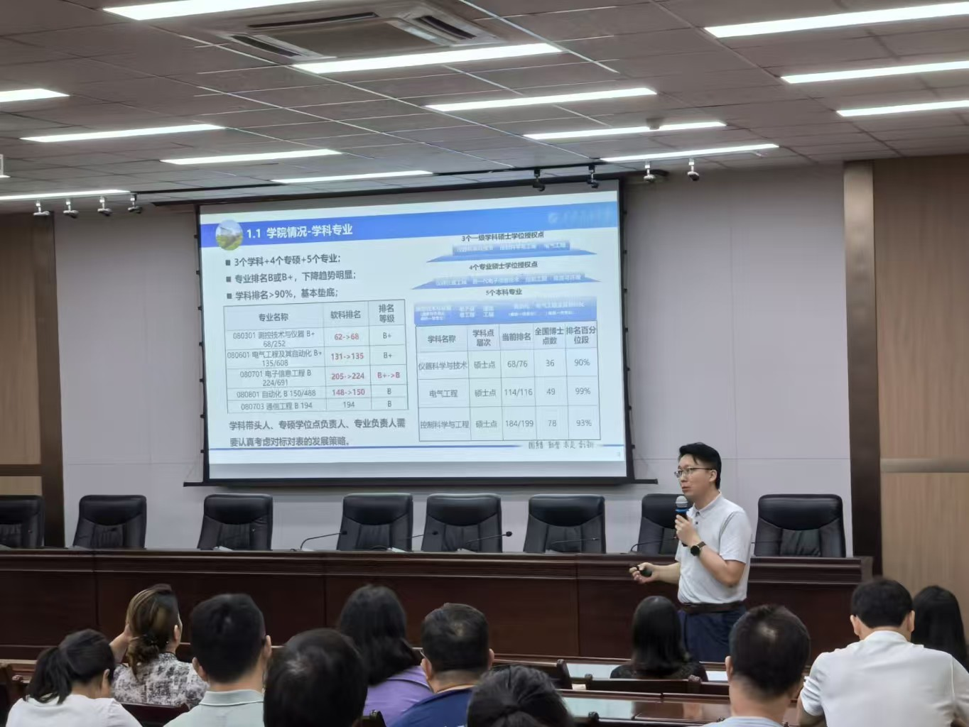 院长李飞重点介绍了学院学科专业的最新发展情况和最新发布的软科排名,强调各学科带头人、专硕学位点负责人和专业负责人要深入对标对表,制定切实可行的发展策略。学院将继续完善教师聘期考核制度,通过定期公示教学工作量、科研积分和公共服务“三张表”,实现多劳多得的激励机制,重点奖励标志性成果,营造争先创优的良好氛围。