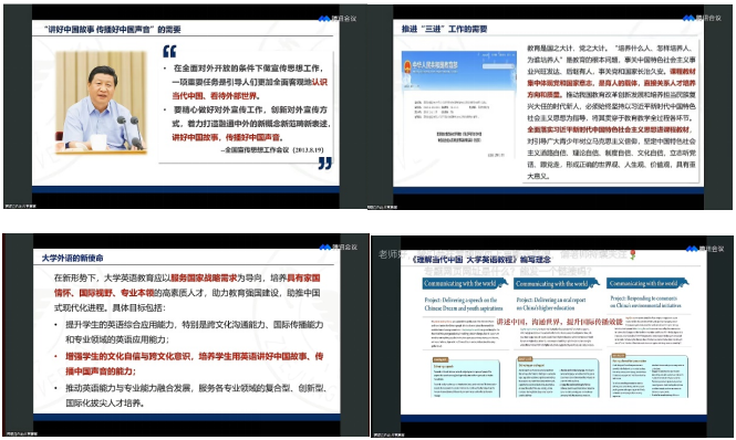 9月3日晚,外国语学院大学外语第一教学部组织全体教师参加由外语教学与研究出版社主办的《理解当代中国大学英语综合教程》虚拟教研室系列研修活动。本次系列研修活动于9月至10月间分五期举行。该系列研修系统覆盖教材编写理念解读、三大单元教学分析与建议以及优秀教案展示与交流等核心环节,着力提升教师对中国话语体系构建和中国叙事能力培养的专业化教学水平。
