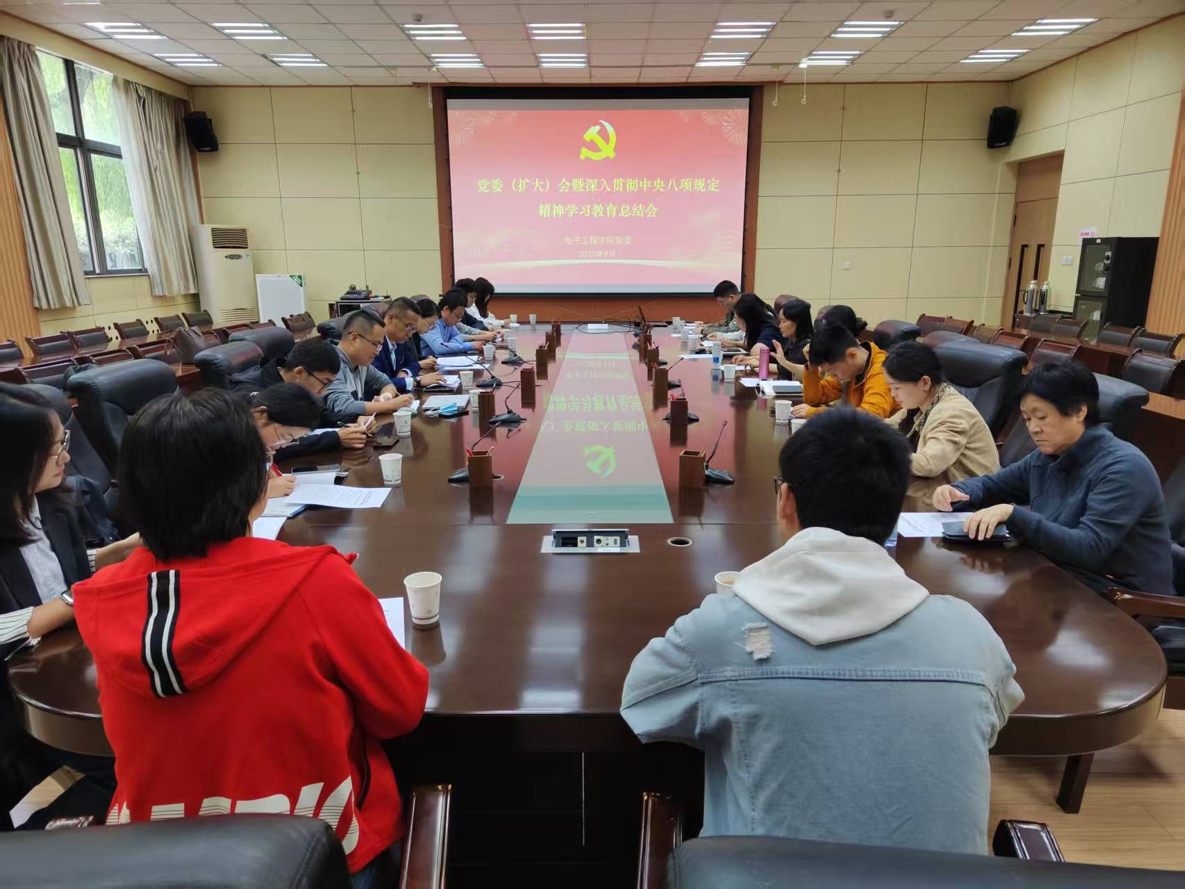 9月19日下午,电子工程学院党委(扩大)会暨深入贯彻中央八项规定精神学习教育总结会在雁塔校区第一会议室召开。学院党委委员、领导班子成员、各办公室主任、各教研室党支部书记、本科生党支部书记及研究生党支部书记参加会议,会议由学院党委书记潘娜主持。