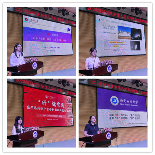 雁塔校区会场上,来自石油工程学院的博士罗开庆以《仰望星空,脚踏实地——研究生科研规划与方法实践分享》为题,结合自身从硕士到博士的科研进阶经历,给同学们分享了科研实践方法建议,希望学弟学妹们在科研学习中勤记录、善总结,并在此基础上运用“嫁接法”“转移法”积极进行科研创新探索。地球科学与工程学院博士章鑫以《让思想落笔,让创新落地:论文与专利的研途双翼》为题,从思、构、写三个方面分享了论文创作的思路和方法,并围绕想、提、护三个关键词为新生讲解了如何进行专利构思、方案提炼以及创新落地。化学化工学院的硕士勇志华以《从“适应”到“起跑”,解锁论文、竞赛与科研生活新节奏》为题,结合自己的申博经历用4个优先级给新生提出研究生科研学习生活的规划建议,同时分享了他悉心整理的AI科研工具集。机械工程学院的硕士张伊晨以《科研竞赛齐驱并进,机械学子的突破与成长》为题,分享了她参加科研竞赛的三个心法:作品选题、团队建设、展示表达,总结出强大的技术加出色的表达,将会助力竞赛的成功。