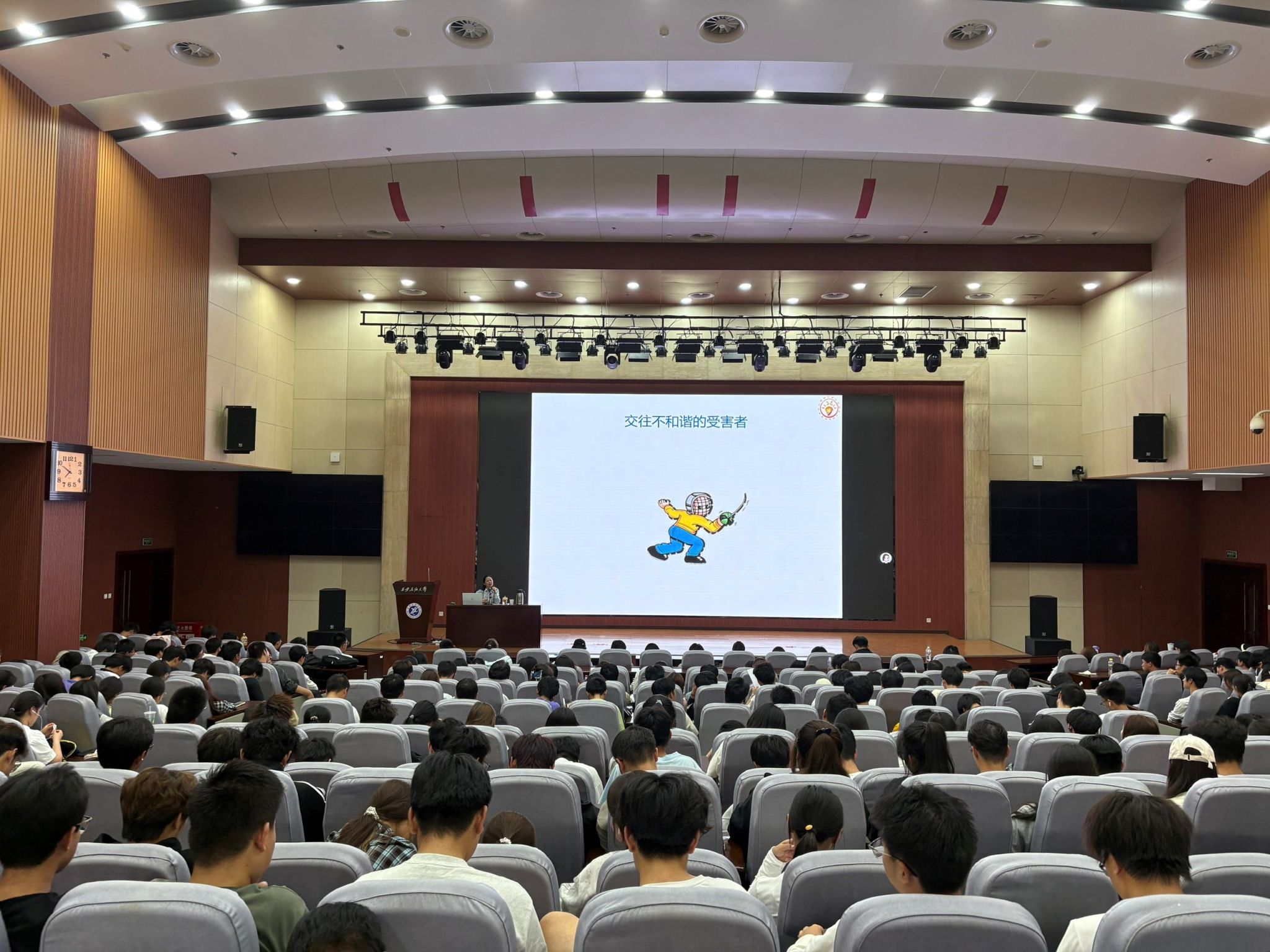 讲座在轻松活泼的互动中拉开帷幕。肖老师以“拍拍肩、拉拉手、吼一吼”的破冰游戏打破陌生感,迅速点燃现场气氛。同学们在欢声笑语中拉近距离,报告厅内暖意流动,为整场讲座奠定了开放而温暖的基调。肖老师从大学生活的日常场景切入,围绕“课堂占座”“图书馆互助”“观点讨论”等真实情境,生动讲述了同窗情谊对个人成长的重要意义。她指出,大学不仅是知识的殿堂,更是人际交往能力提升的关键阶段,良好的同伴关系是大学四年中最珍贵的“成长礼物”。