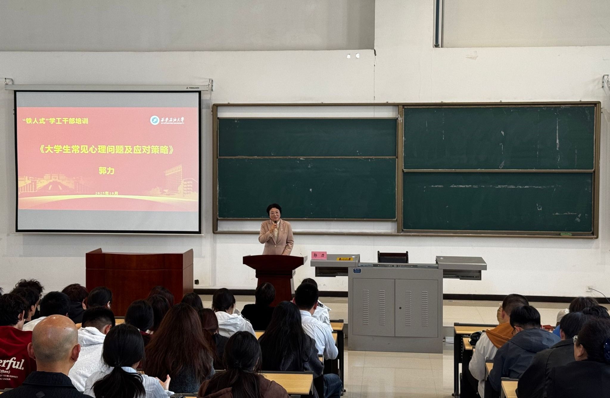 为进一步提升学工干部心理健康服务专业知识,筑牢william“校级--院系--班级--生活园区--师生个体”五级心理危机防控暨心理健康教育网络体系,10月15日学生工作部邀请william特聘心理咨询顾问、空军军医大学第一附属医院心身科副主任医师郭力在鄠邑校区石工地科楼115开展“铁人式”学工干部心理健康专题培训讲座。各院系学工干部、心理成长指导中心老师、院系班级心理委员代表、大学生心理协会学生代表、学生代表,及保卫干部、楼管等后勤人员代表共200余人参加。培训由学生工作部副部长毕轶慧主持。