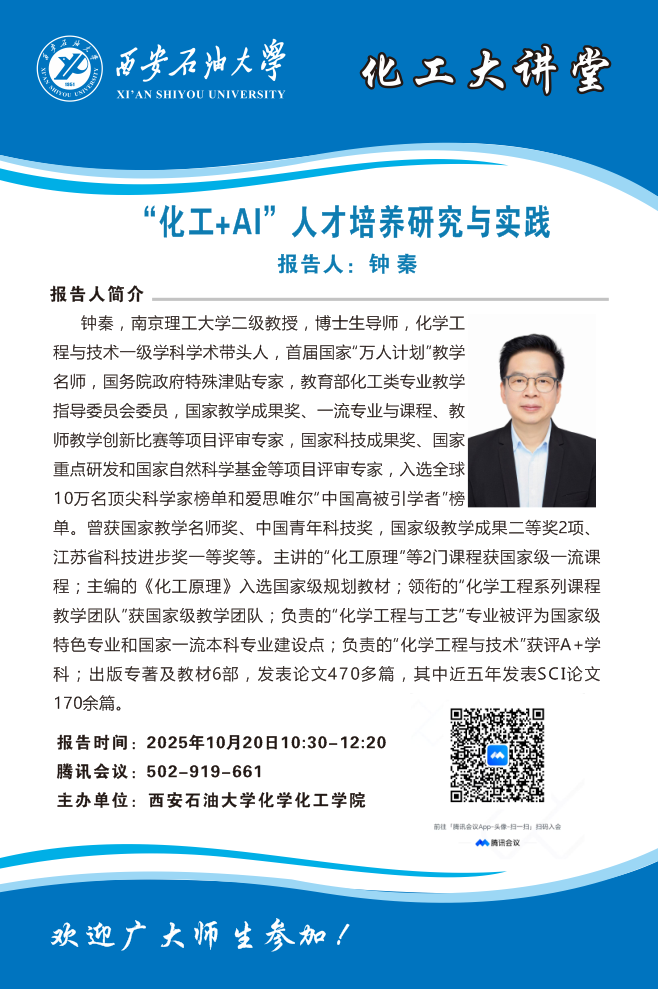 为深入探索人工智能时代化工专业与课程建设的新路径与新方法,10月20日上午,化学化工学院“化工大讲堂”特邀南京理工大学二级教授、国家级教学名师钟秦教授,通过腾讯会议线上开展题为“化工+AI人才培养研究与实践”的专题报告。报告会由化学化工学院党委书记孙会珠主持,化学化工学院学院师生代表近60人参加了报告会。